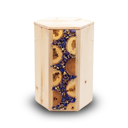 Die Äste der Holzurnen werden mit unserem selbst entwickelten, zu 100% natürlichen Harz verbunden. In dieses Harz werden anschließend Naturmaterialien eingelegt. Diese sind beliebig mit unseren Holzarten kombinierbar.